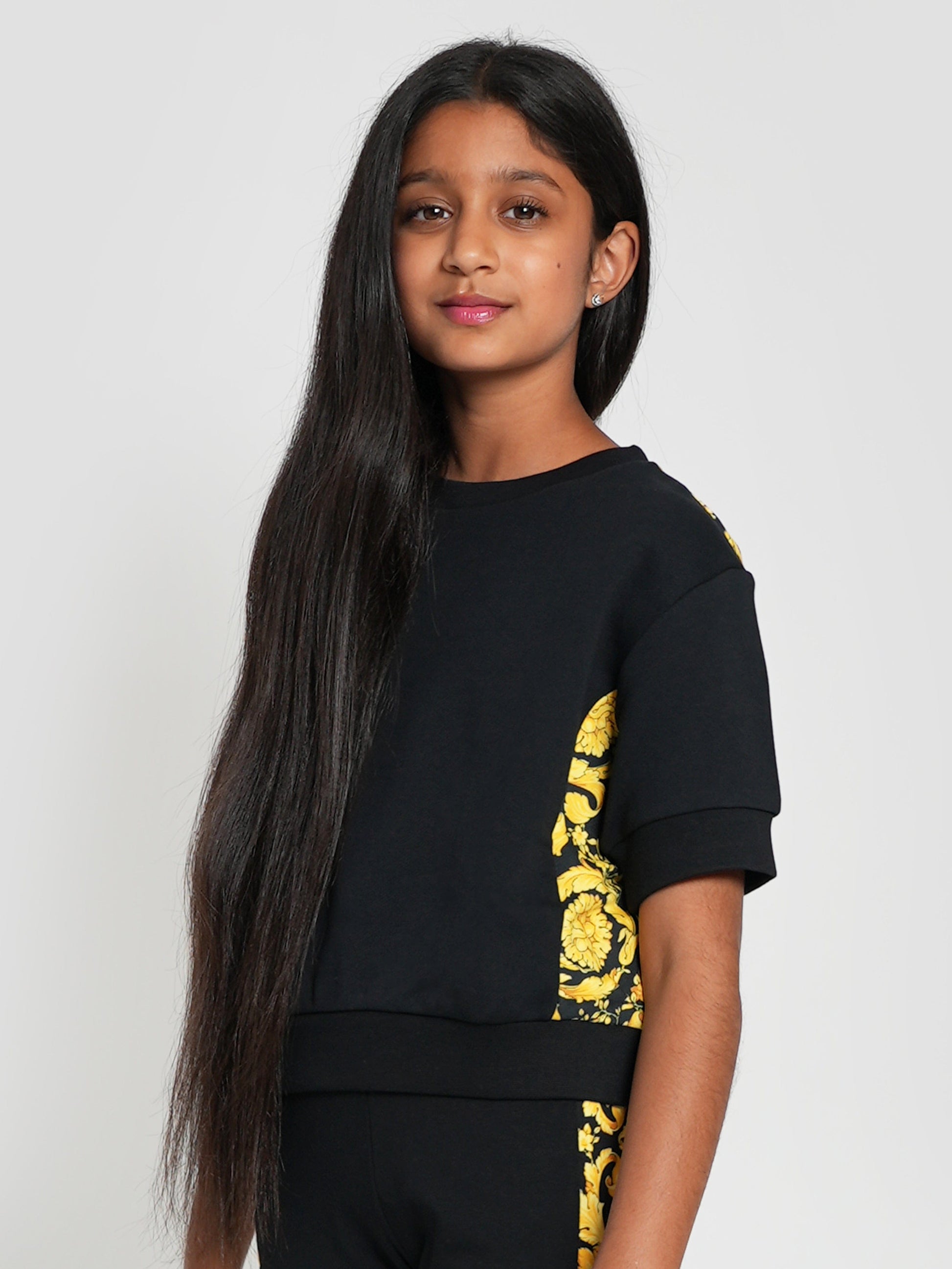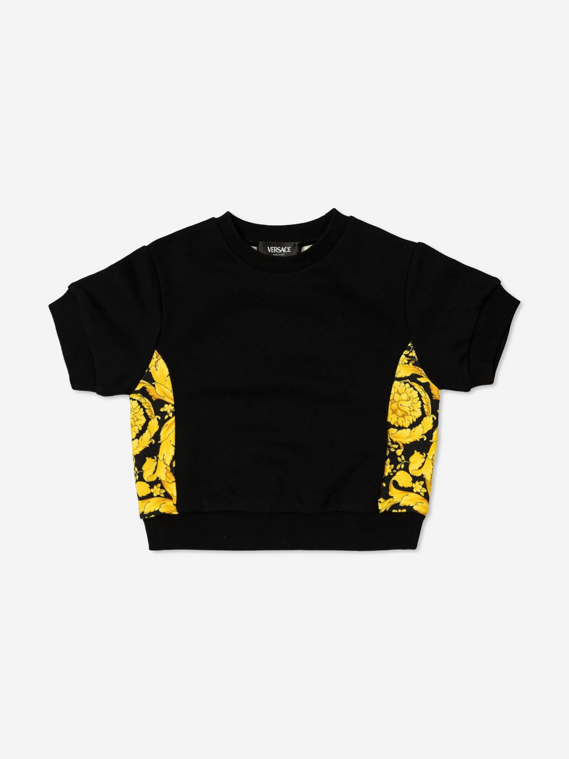 温馨提示:该商品下单后不支持取消订单,请您在购买前确认商品信息无误。商品如有缺货情况,订单会自动取消退款。预计收货时间为1至2周。 Versace project fine detailing into their opulent aesthetics. This girls sweatshirt is reflective of the label's passion for innovation. An exquisite garment epitomising the luxurious essence of its Italian heritage. It showcases an intricate ‘Barocco’ motif, gracefully adorning the sleeves and the entire back with a lavish array of yellow and gold patterns set against a stark black backdrop, accentuating its unique character.