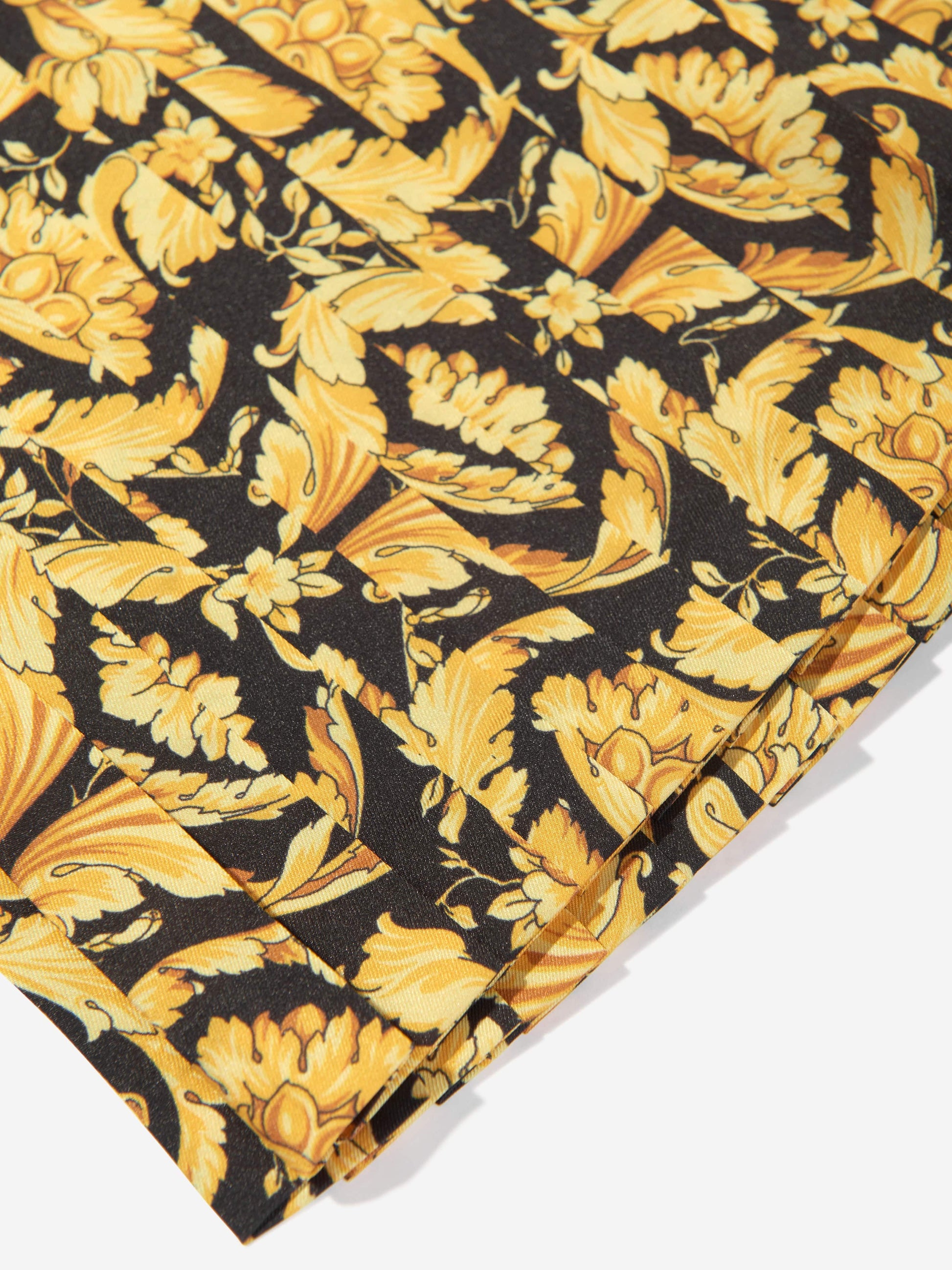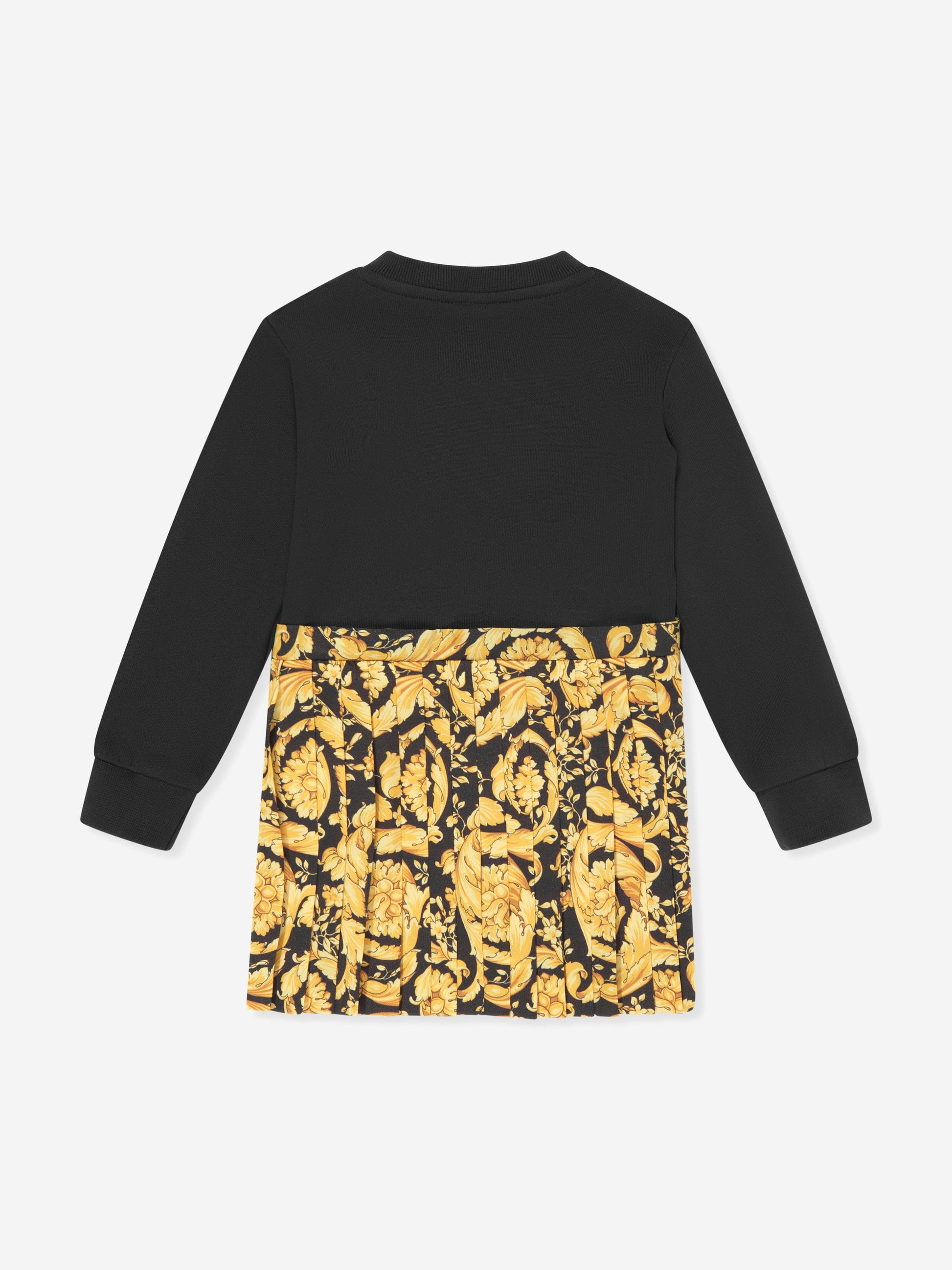 温馨提示:该商品下单后不支持取消订单,请您在购买前确认商品信息无误。商品如有缺货情况,订单会自动取消退款。预计收货时间为1至2周。 Versace envision bold, innovative abstracts in their beautifully haute couture abstracts. This baby girls black sweater dress encapsulates the Italian label's passion for daring and unparalleled technology. Envisioned in soft, stretchable knit fabric via a yellow and black striking baroque motif. It showcases an embroidered logo on the left wrist with a satin skirt that has a slight ruching/pleating effect.