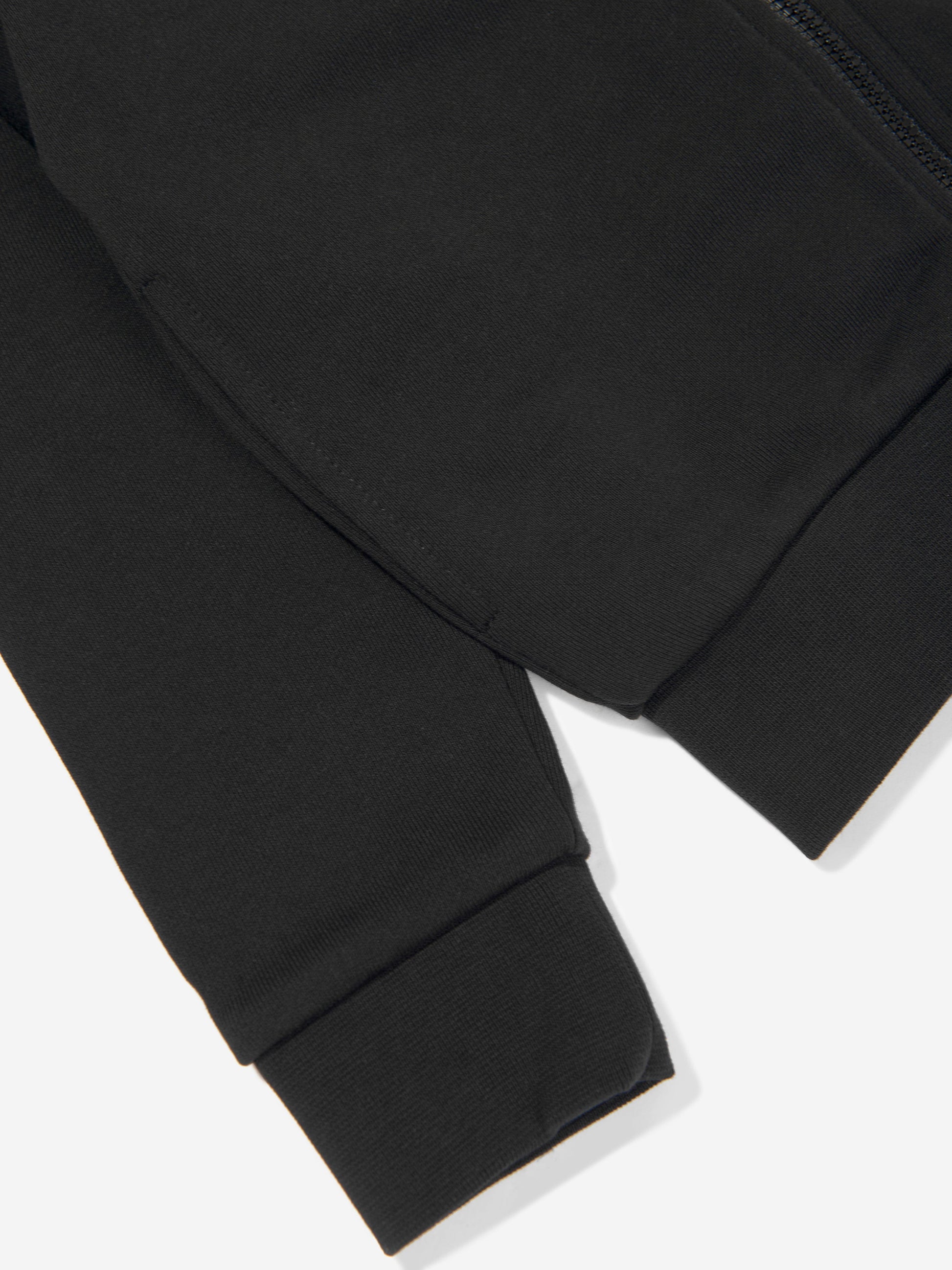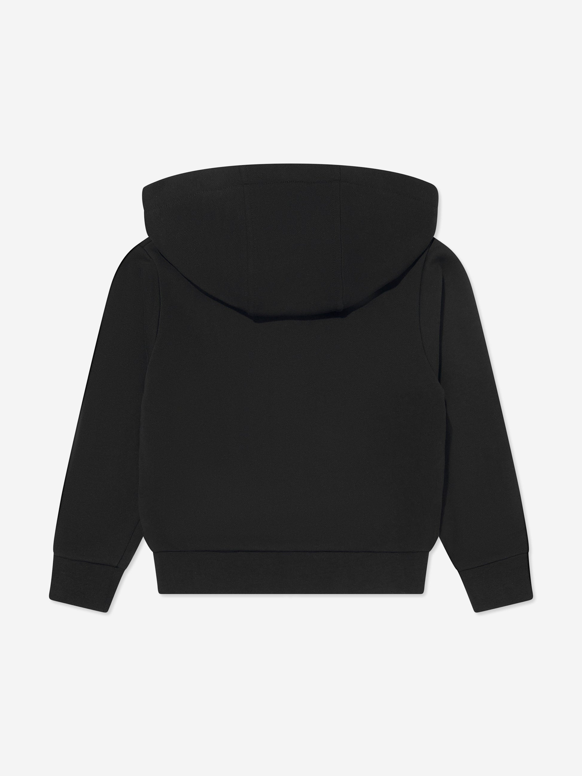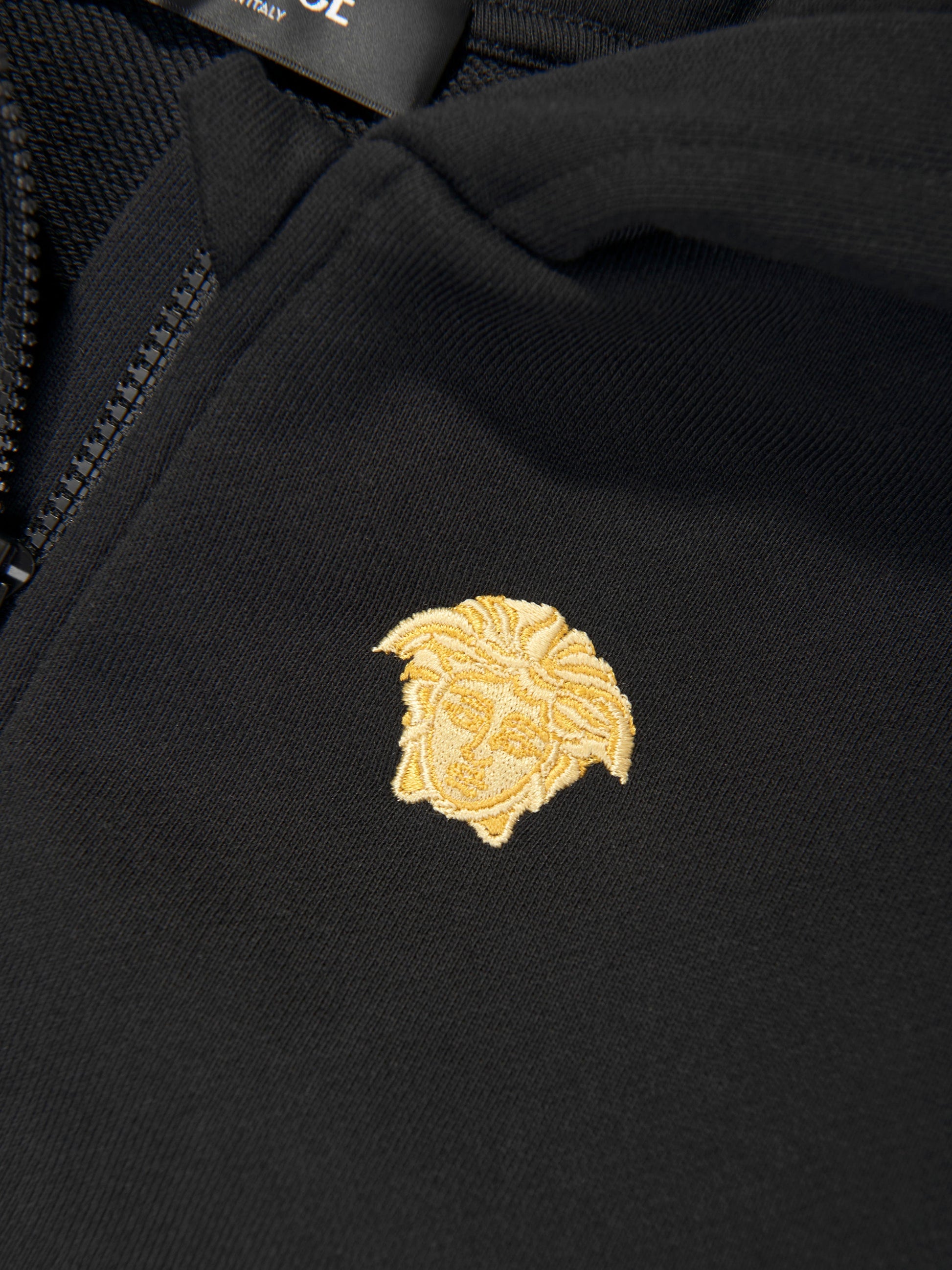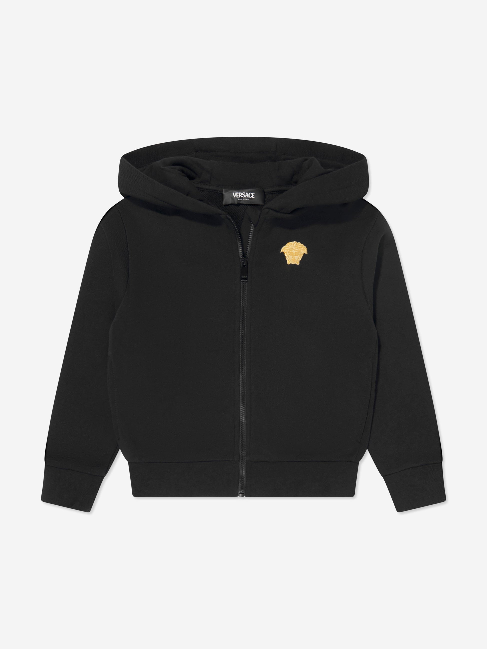 温馨提示:该商品下单后不支持取消订单,请您在购买前确认商品信息无误。商品如有缺货情况,订单会自动取消退款。预计收货时间为1至2周。 Versace project fine detailing into their opulent aesthetics. This boys black zip up is reflective of the label's passion for innovation. An exquisite garment epitomising the luxurious essence of it's Italian heritage. It showcases a hood and iconic 'Medusa' patch embroidered on the chest.