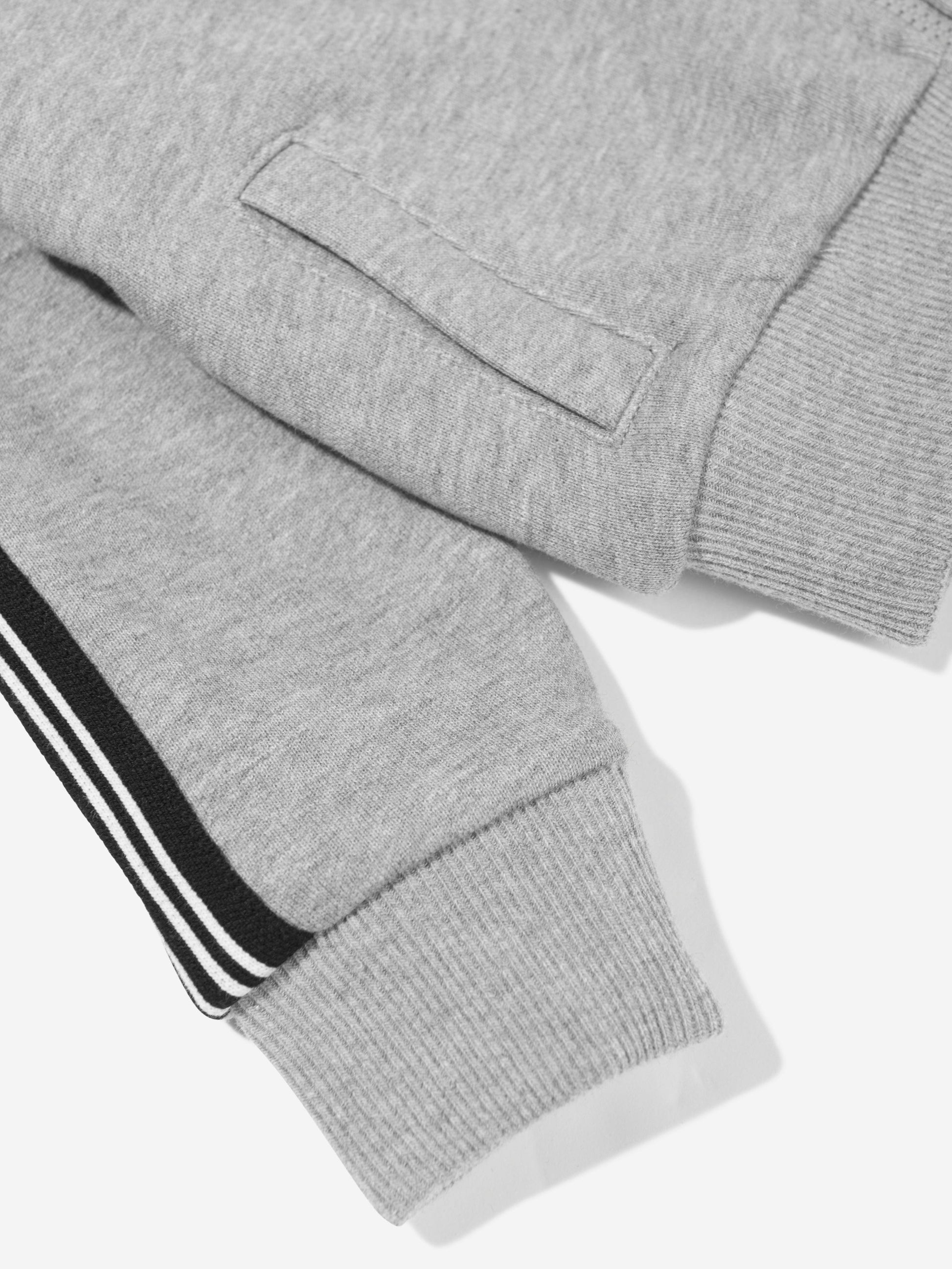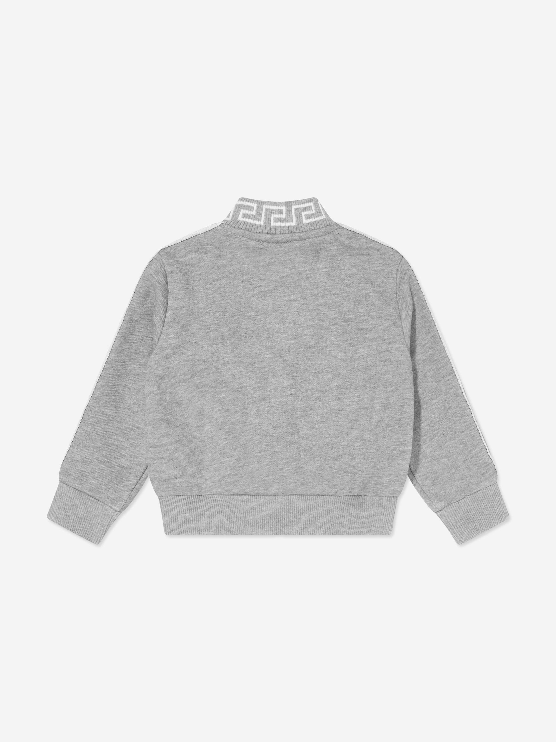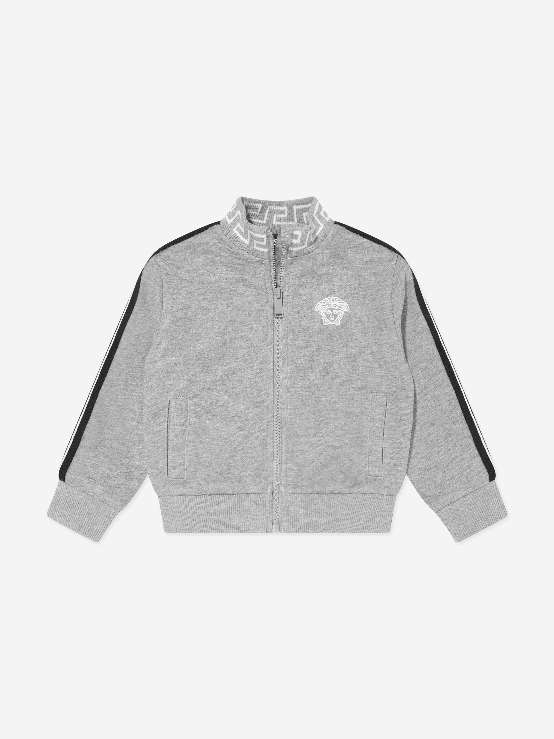温馨提示:该商品下单后不支持取消订单,请您在购买前确认商品信息无误。商品如有缺货情况,订单会自动取消退款。预计收货时间为1至2周。 Versace envision bold, innovative abstracts in their beautifully crafted aesthetics. This baby boys grey zip up captures the Italian label's passion for daring and unparalleled technology. Envisioned with an embroidered logo on the left chest, depicting the profile of a classic Greek statue subtle emblem. It showcases white contrasting stripes and the enigmatic geometric pattern on the neck.