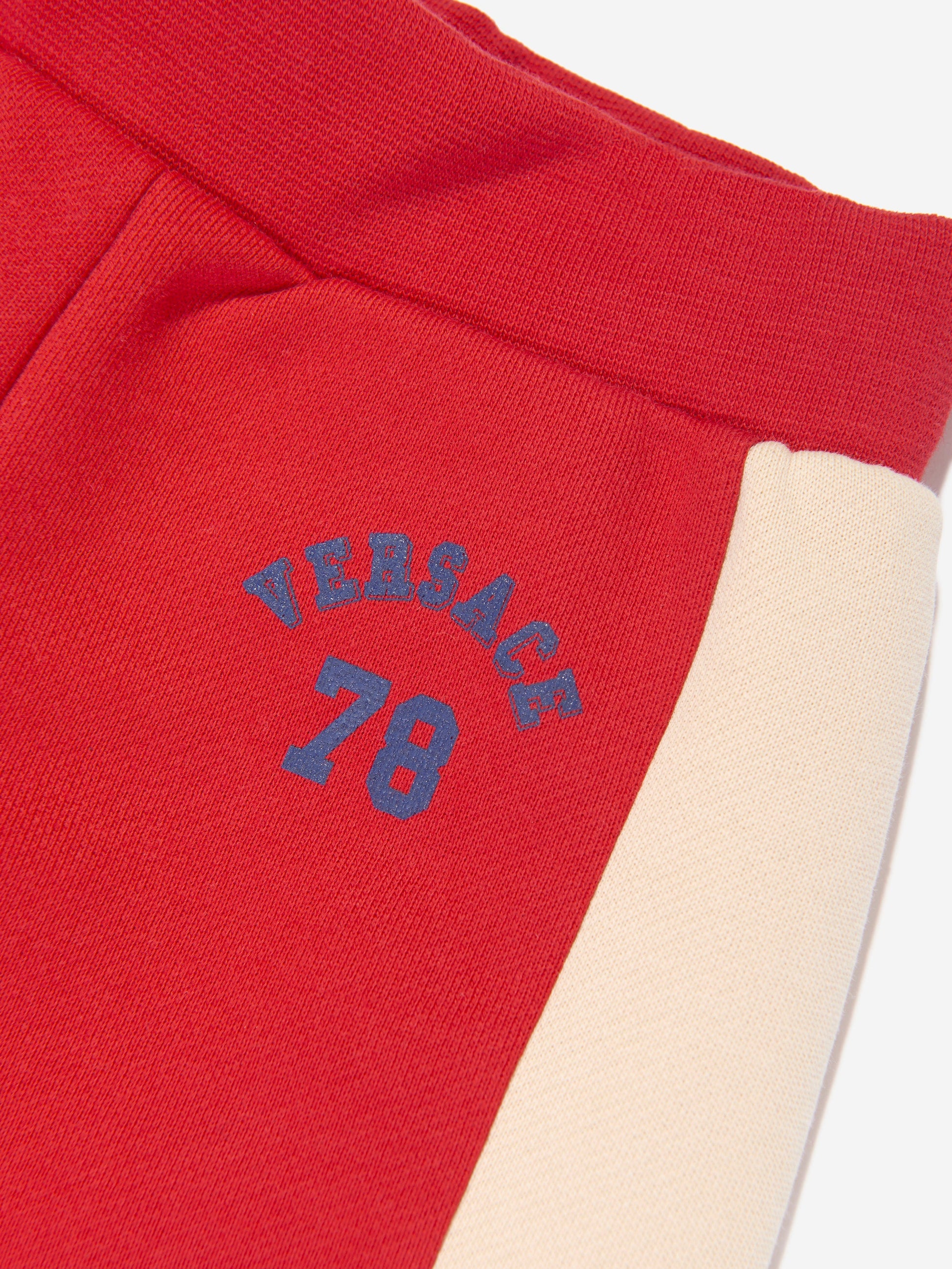 温馨提示:该商品下单后不支持取消订单,请您在购买前确认商品信息无误。商品如有缺货情况,订单会自动取消退款。预计收货时间为1至2周。 Versace project fine detailing into their opulent aesthetics. These baby boys joggers are reflective of the label's passion for innovation. An exquisite garment epitomising the luxurious essence of it's Italian heritage. Envisioned in red and beige, they are accentuated by contrasting inserts and the embroidered "VERSACE 78" in navy.