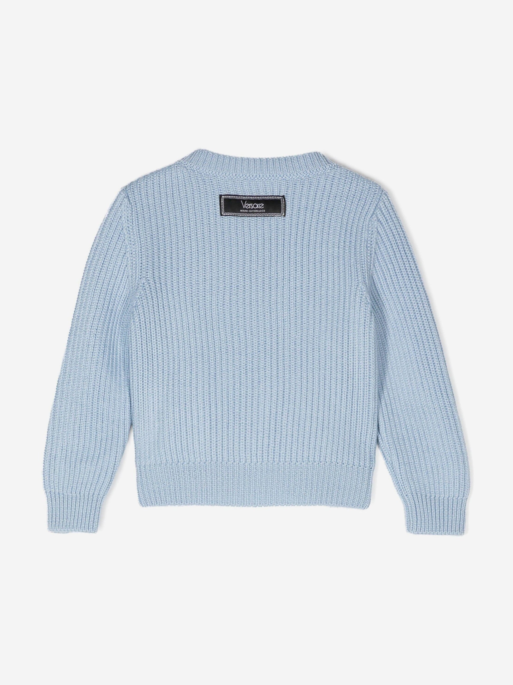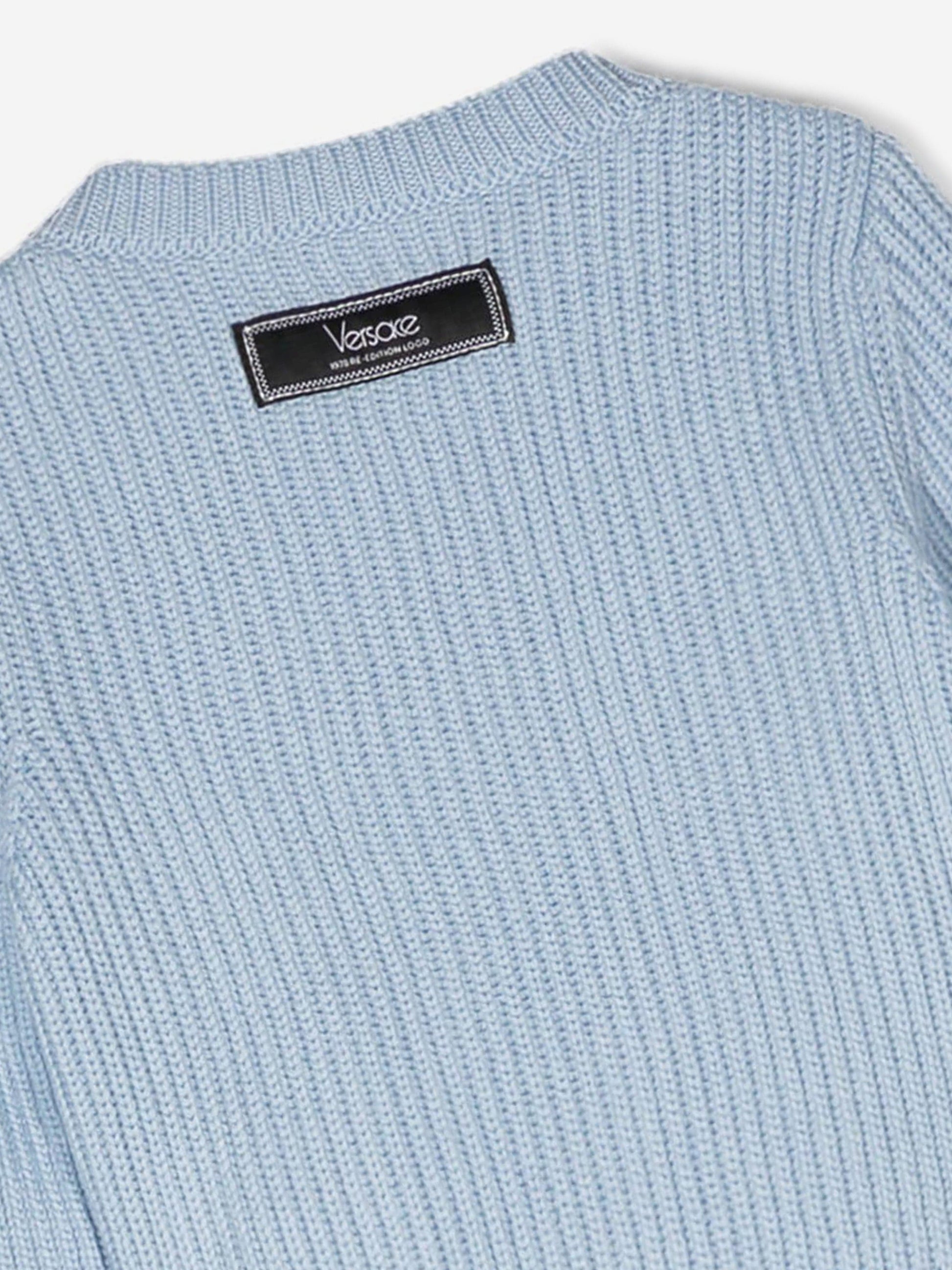 a soft cable-knit sweater featuring an embroidered refreshed archival Versace Logo from 1978.