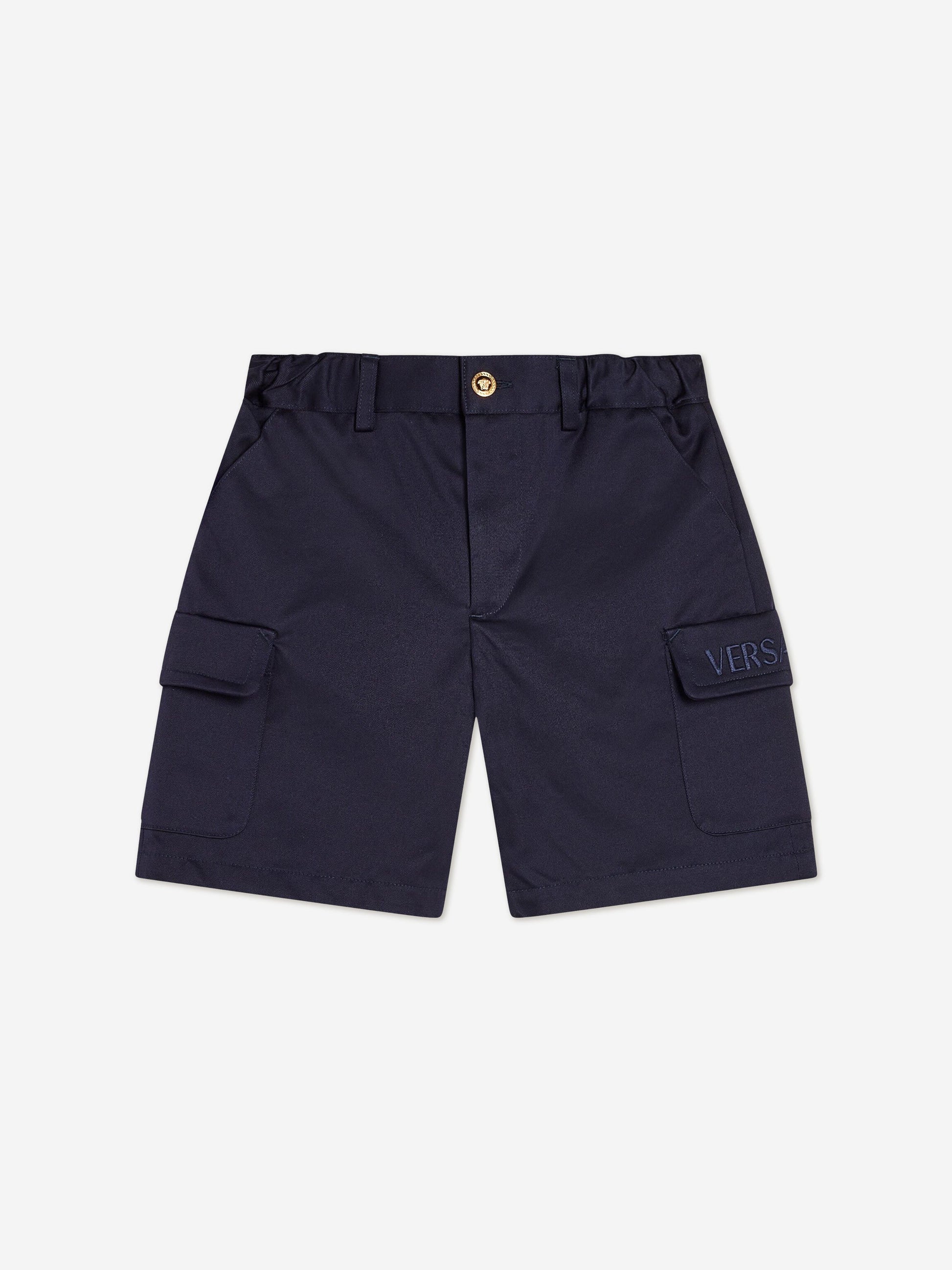 温馨提示:该商品下单后不支持取消订单,请您在购买前确认商品信息无误。商品如有缺货情况,订单会自动取消退款。预计收货时间为1至2周。 Introducing the exquisite Boys Logo Cargo Shorts in Blue by Versace, an elite addition for AW2024. Masterfully crafted in Italy, these shorts are an embodiment of luxury and style for your young one. Key features include: