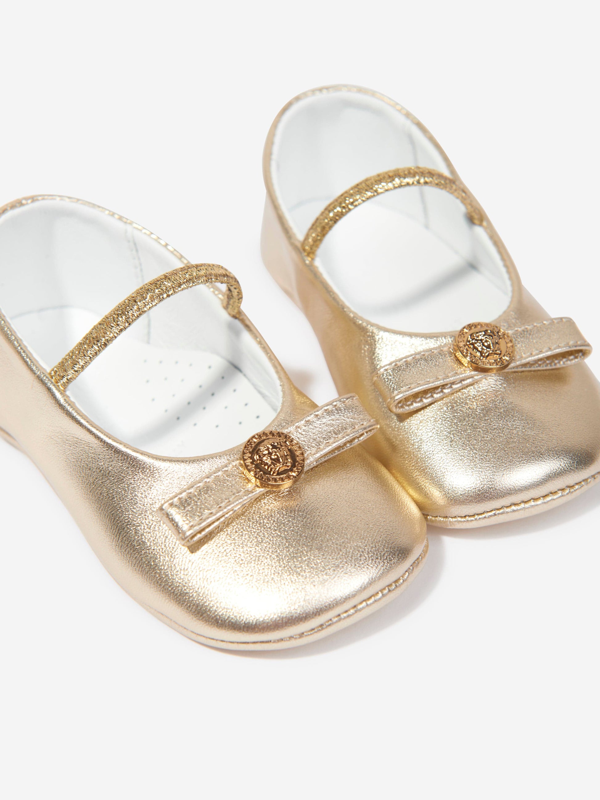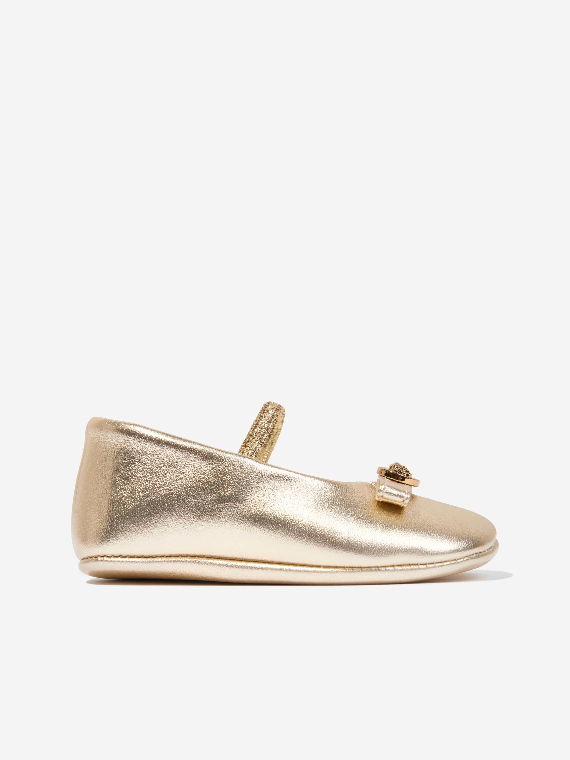 温馨提示:该商品下单后不支持取消订单,请您在购买前确认商品信息无误。商品如有缺货情况,订单会自动取消退款。预计收货时间为1至2周。 Versace project fine detailing into their opulent aesthetics. These baby girls gold ballerina pumps are reflective of the label's passion for innovation. An exquisite garment epitomising the luxurious essence of it's Italian heritage. They are crafted in a metallic finish via beautiful lambskin with a round toe and elastic strap. Complete with Medusa hardware, she will be obsessed.