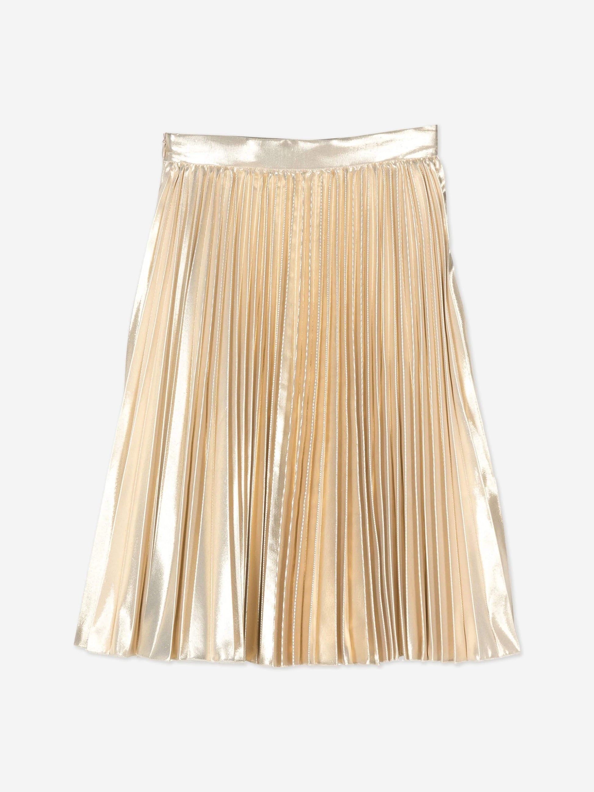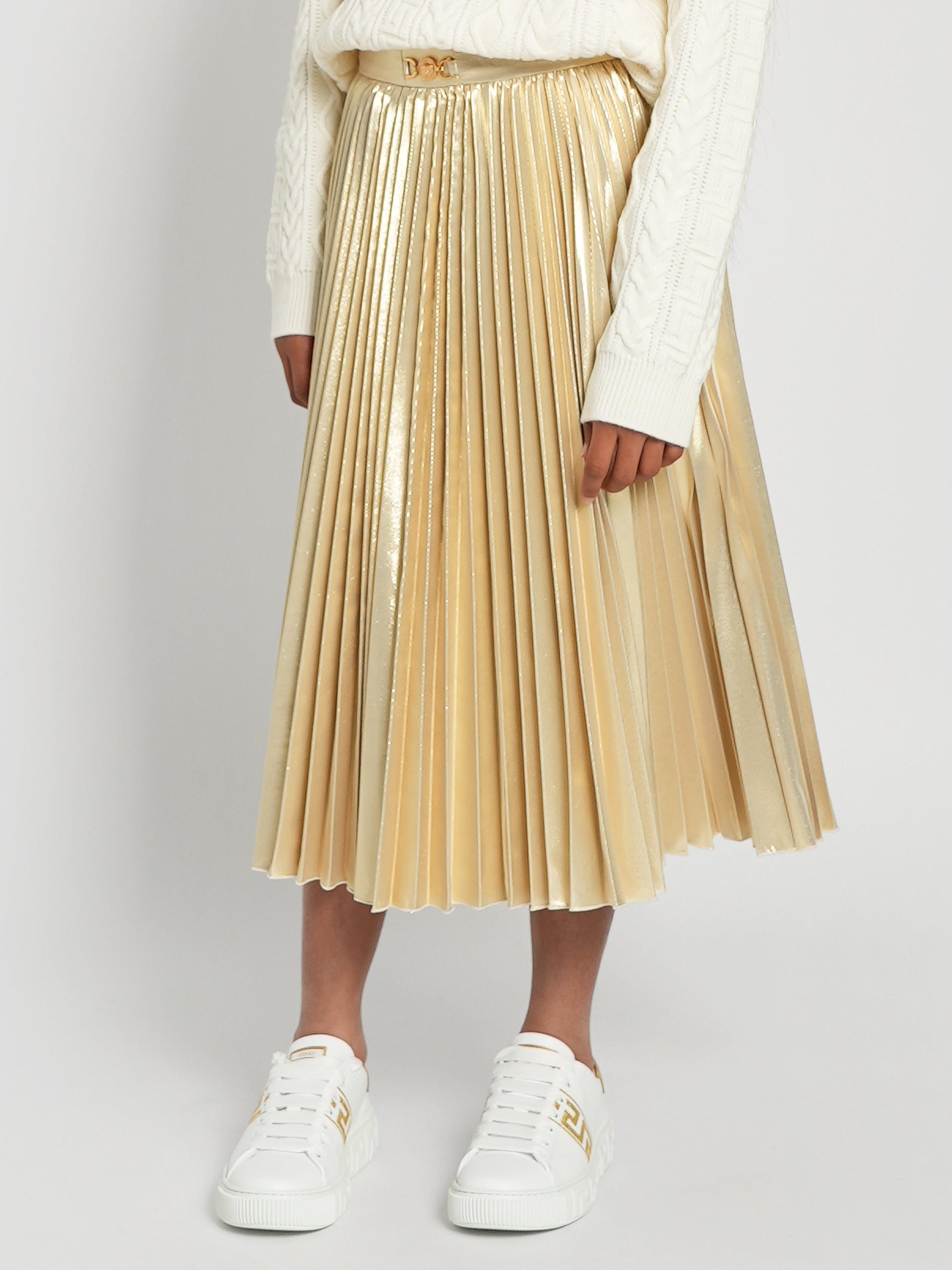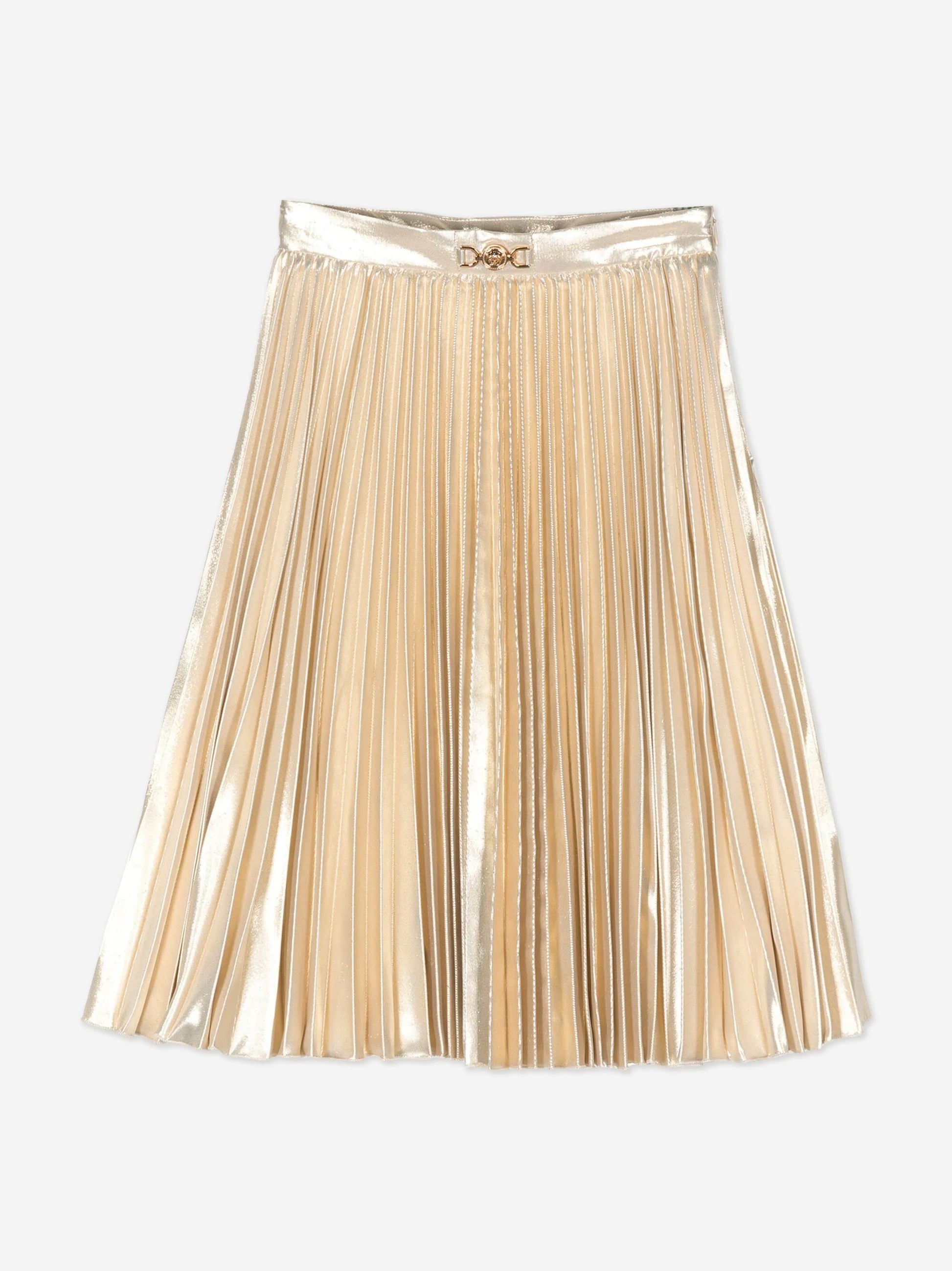 温馨提示:该商品下单后不支持取消订单,请您在购买前确认商品信息无误。商品如有缺货情况,订单会自动取消退款。预计收货时间为1至2周。 Versace project fine detailing into their opulent aesthetics. This girls gold skirt is reflective of the label's passion for innovation. An exquisite product epitomising the luxurious essence of it's Italian heritage. Crafted from refined material, showcasing a pleated design via a shiny metallic finish. It is signified by the accent Medusa '95 at the lightly padded waistband.