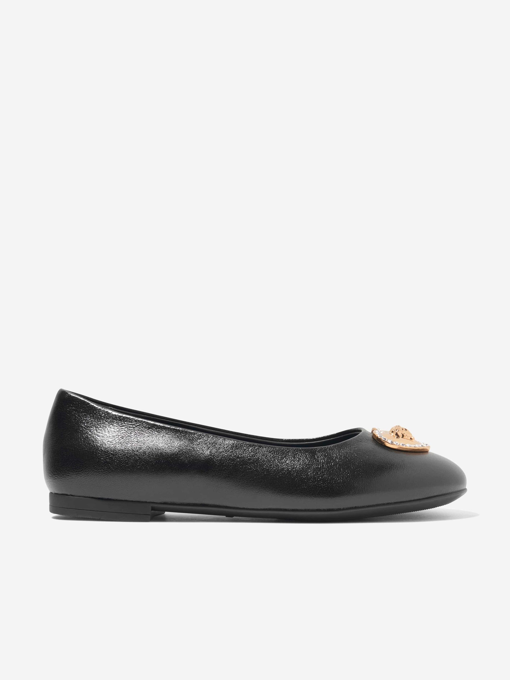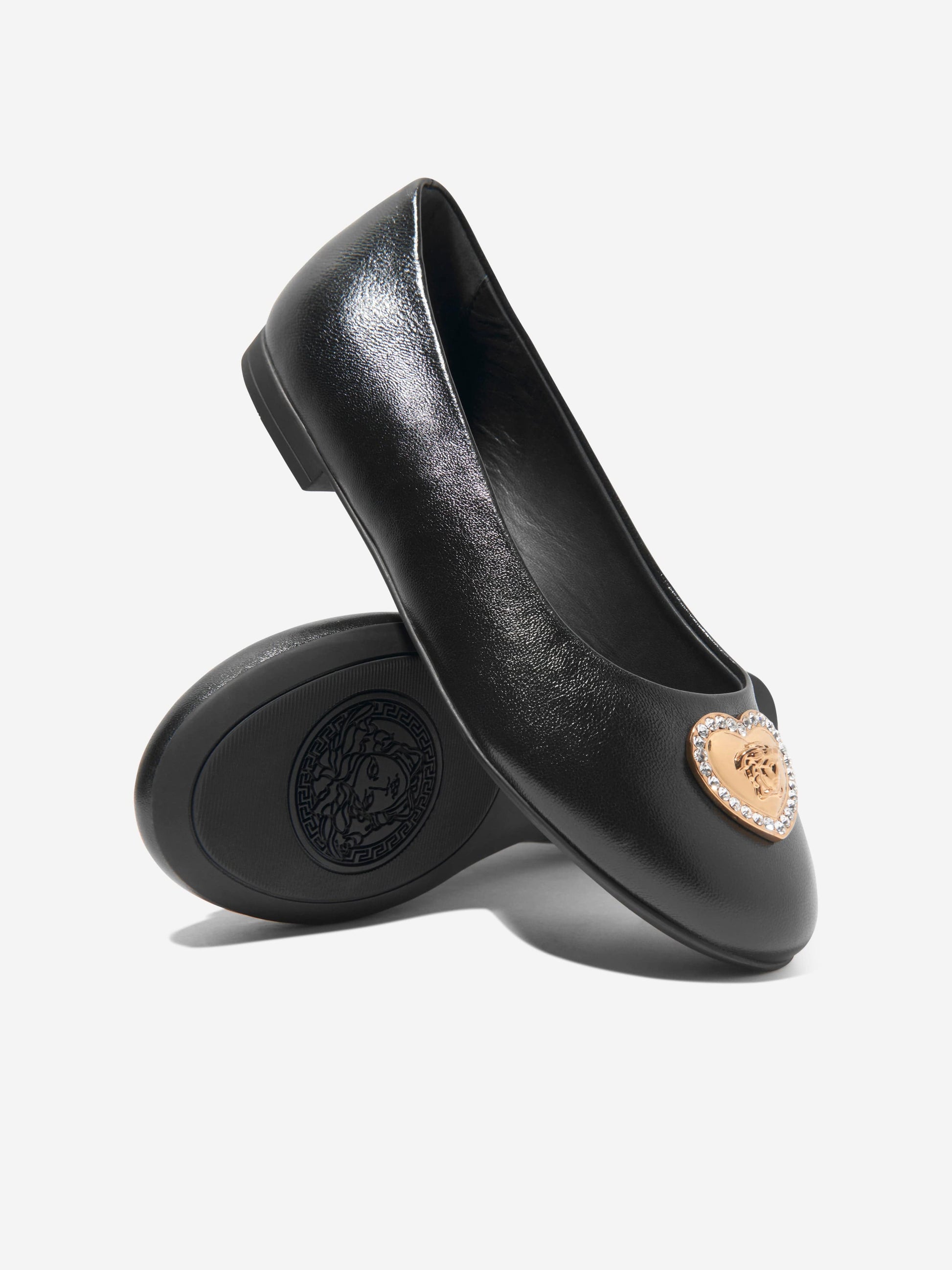 • Amplify her collection with the Versace’s Girls Leather Ballerina Pumps in Black. Add this captivating piece to the cart and let her twinkle in the crowd.