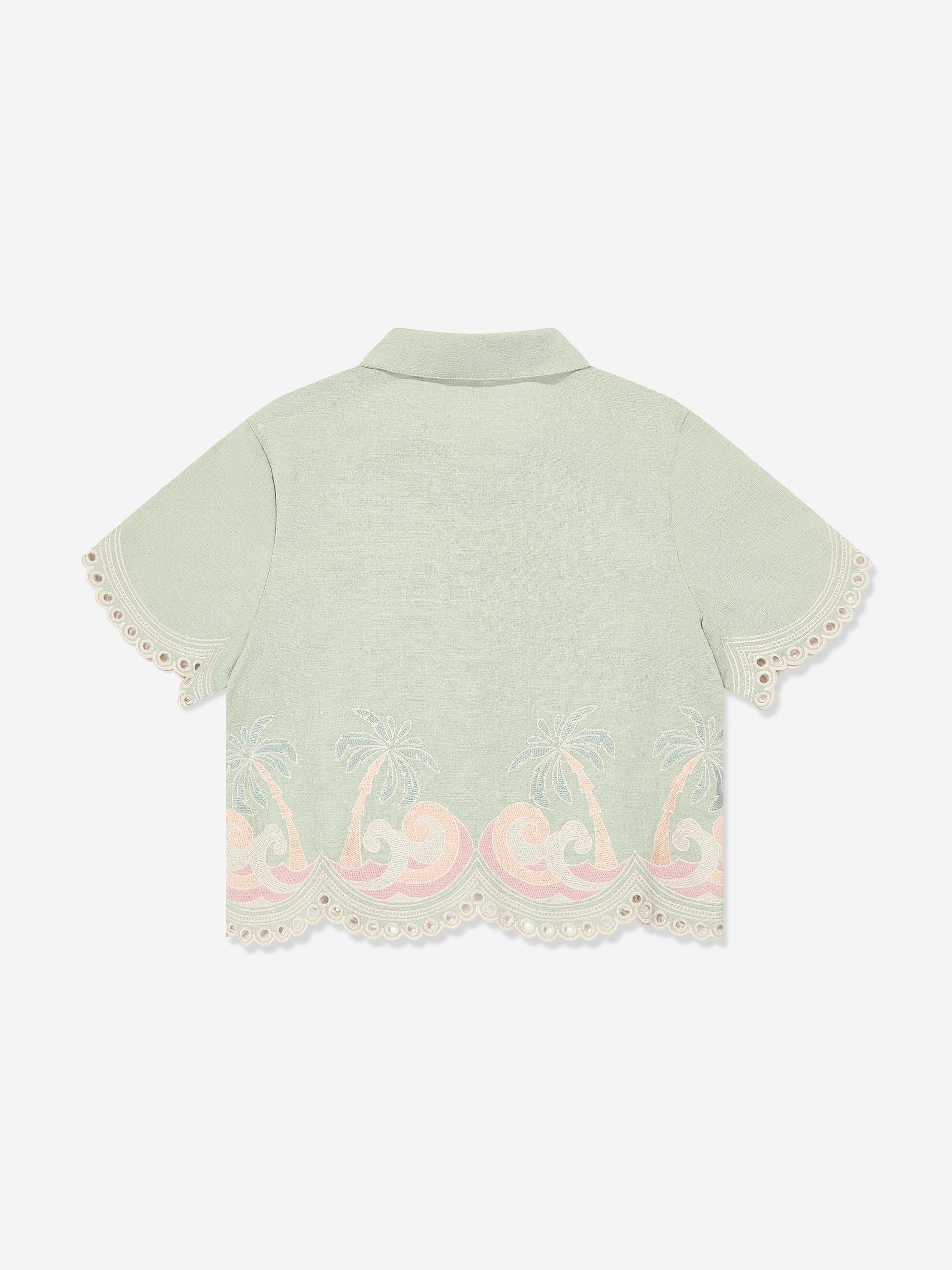 温馨提示:该商品下单后不支持取消订单,请您在购买前确认商品信息无误。商品如有缺货情况,订单会自动取消退款。预计收货时间为4至6周。 Australian label Zimmermann combine superior cutting with spellbinding silhouettes. This girls tallow blouse captures the brand's Bohemian essence within high quality and superior resort wear. Woven in a beautiful light sage green via a textured cotton fabric. It is embroidered with palm trees and swirling waves in shades of pink and orange.