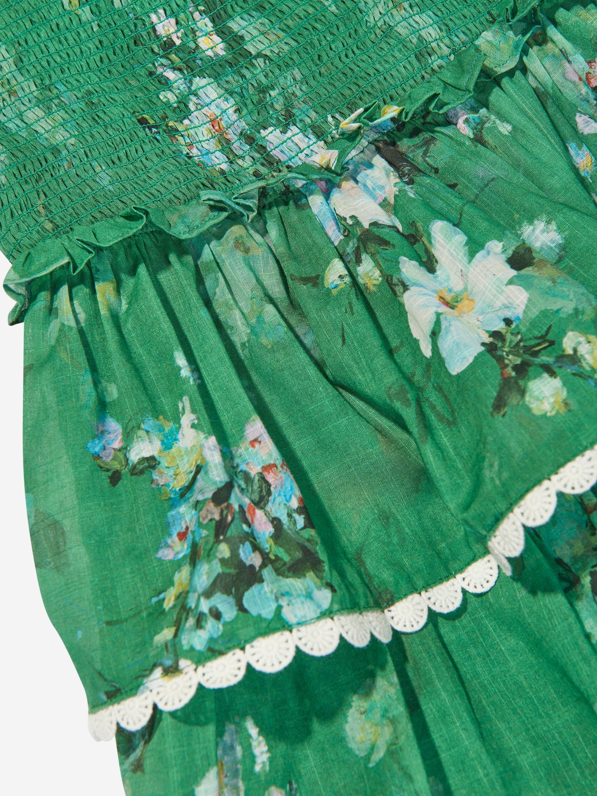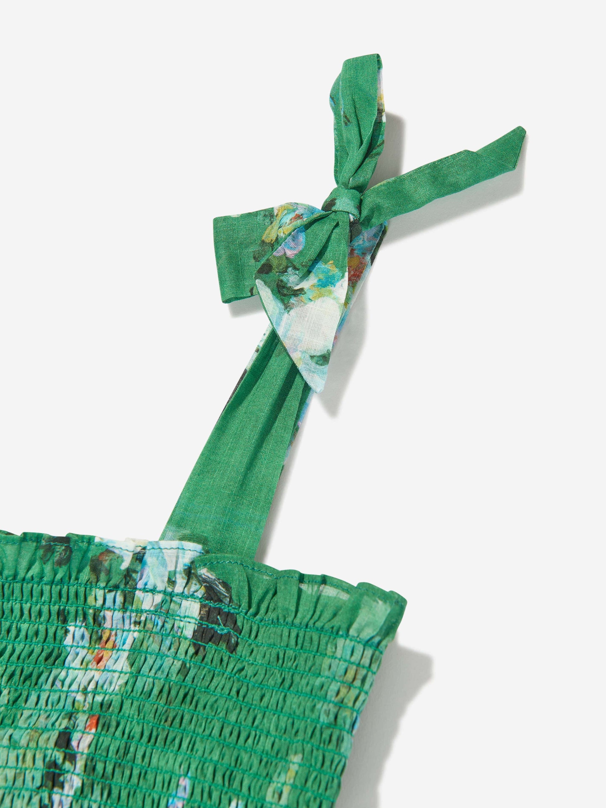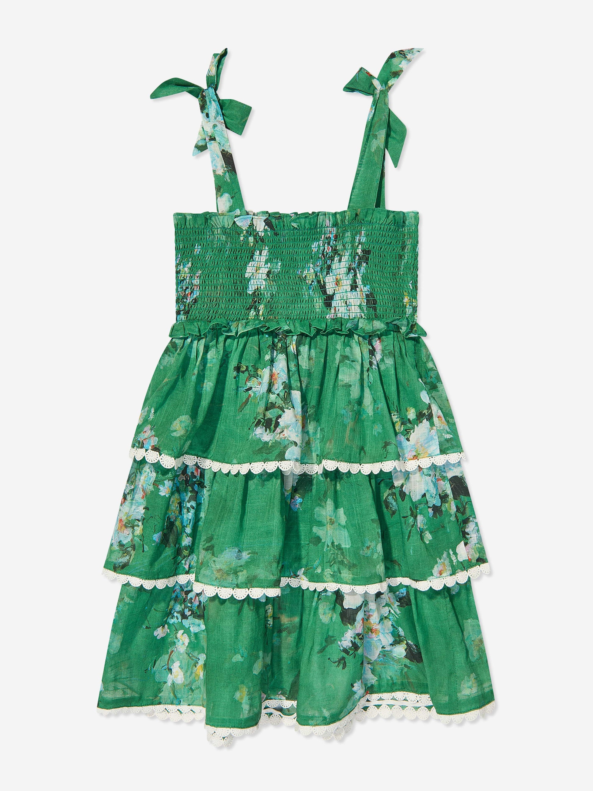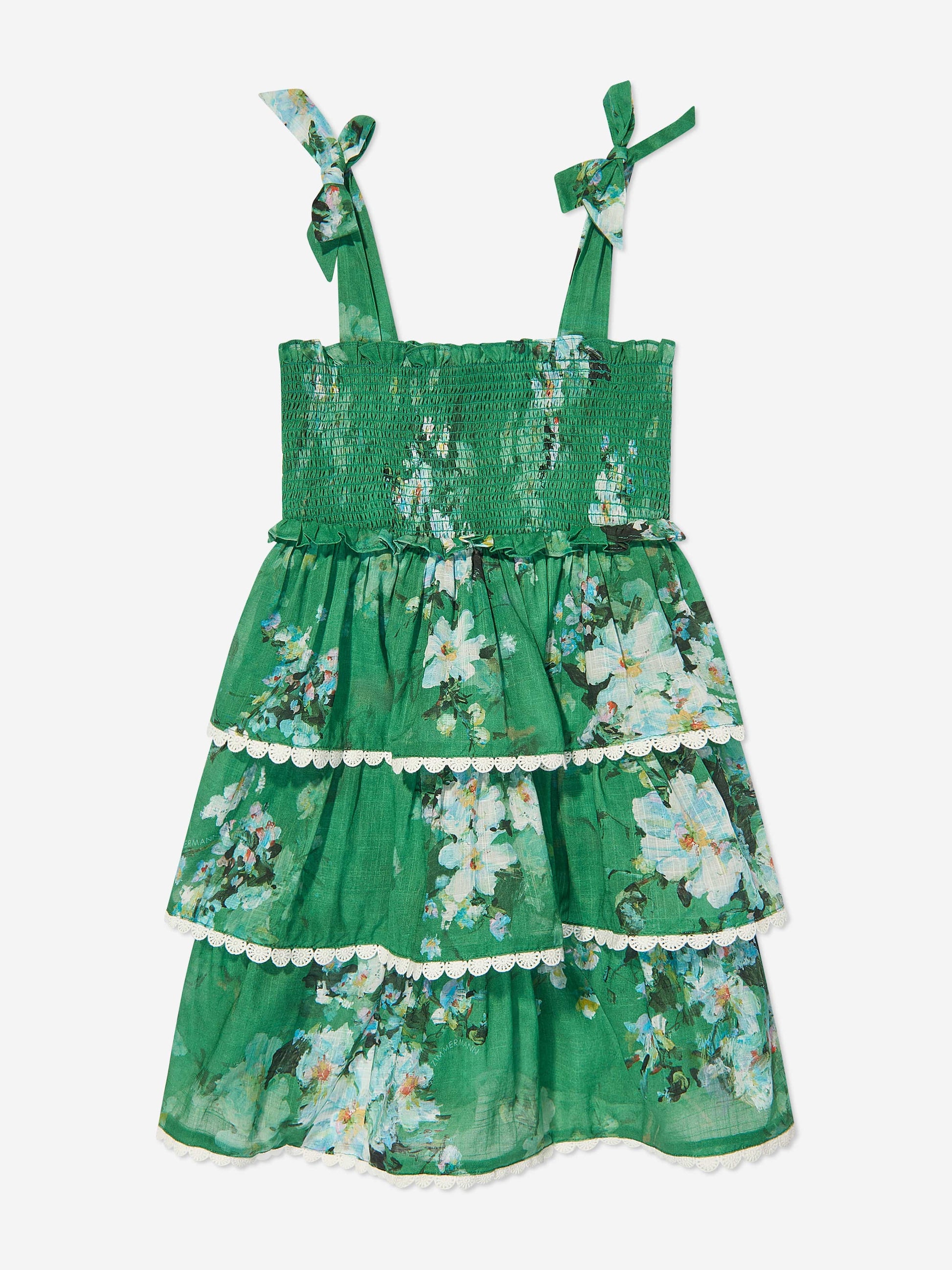 温馨提示:该商品下单后不支持取消订单,请您在购买前确认商品信息无误。商品如有缺货情况,订单会自动取消退款。预计收货时间为4至6周。 Australian label Zimmermann deconstruct the trend principle by exploring distinctive avenues of colour and craftsmanship. This girls Everley tiered shirred dress is woven in a beautiful lightweight voile design with a beautiful watercolour-inspired floral pattern. The shoulder straps have fixed bows, whilst the bodice is shirred and the tiered skirt has white, floral lace trims.